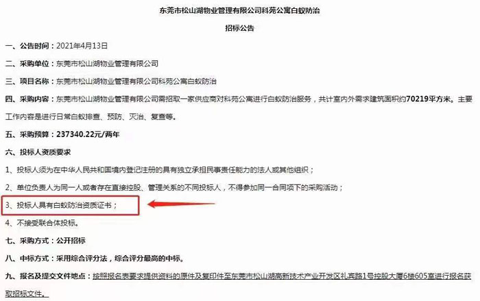 物業(yè)管理公司公寓白蚊防治招標要求有白蟻防治資質